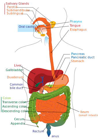 - الفم: تبدأ عملية الهضم هنا. حيث يتم مضغ الطعام بواسطة الأسنان وتقطيعه إلى أجزاء أصغر، وتختلط مع اللعاب الذي يحتوي على إنزيمات هضمية تبدأ في تكسير الكربوهيدرات.